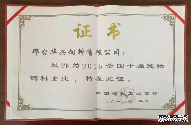 2016年12月9日,中國(guó)飼料工業(yè)協(xié)會(huì)第七次會(huì)員代表大會(huì)在北京召開(kāi),會(huì)議對(duì)2016年度中國(guó)飼料工業(yè)協(xié)會(huì)先進(jìn)集體及先進(jìn)工作者進(jìn)行了表彰, 華興公司榮獲“2016全國(guó)十強(qiáng)寵物飼料企業(yè)”稱(chēng)號(hào)。