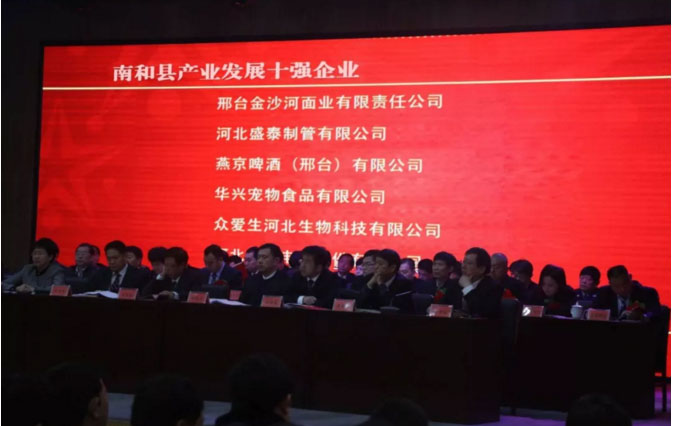 會議期間,頒發了多個獎項,各獲獎企業代表紛紛上臺領獎,縣委副書記、政府縣長韓明智同志為各企業頒獎。大會取得圓滿成功,與會企業深受鼓舞。華興寵物食品有限公司榮獲”南和縣產業發展十強企業“稱號。
